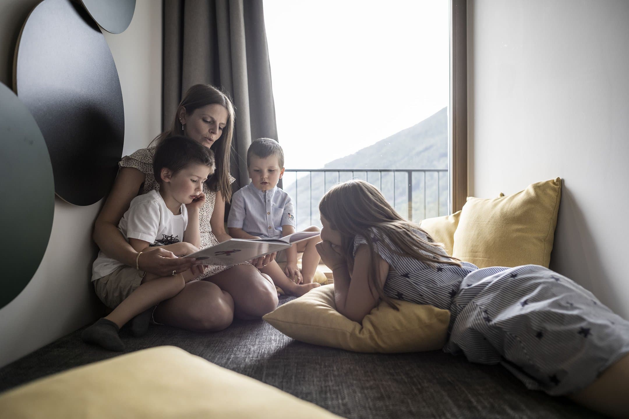 Das Zimmer – ganz in Apfelholz gestaltet und Teppichboden – mit Schreibtisch zum Malen, Couchecke zu einem verwandelbaren Stockbett mit Matratze zum Vorlesen und einem Balkon oder einer Terrasse zum Träumen bietet Platz für gemeinsame Zeit und erholsamen Schlaf für eine ganze Familie.
